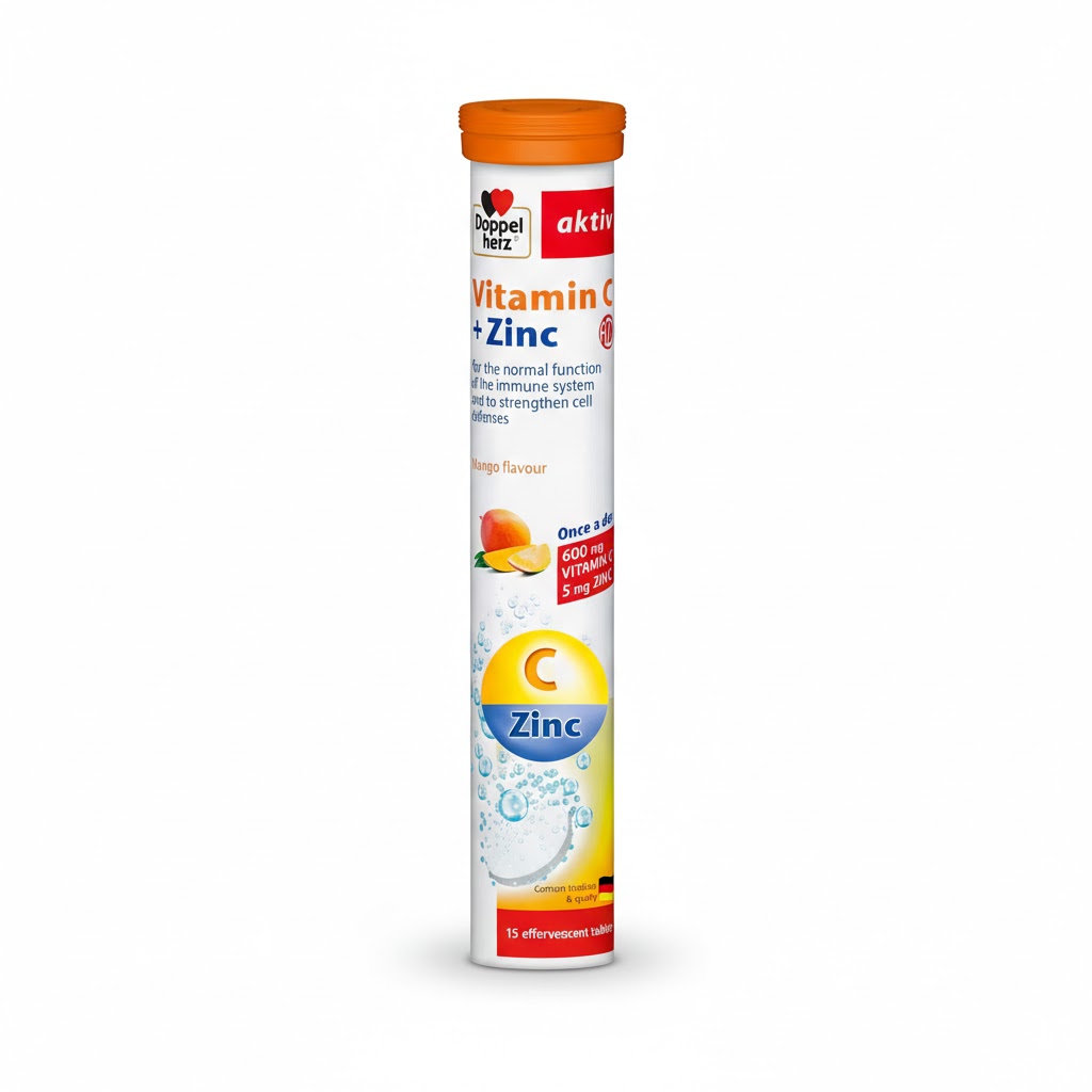 Doppelherz Aktiv Vitamin C + Zinc Effervescent Tablets are specially formulated to support immune health, antioxidant protection, and overall wellness. Each tablet provides 600mg of vitamin C combined with zinc, a mineral known to contribute to normal immune system function. The effervescent formula dissolves quickly in water, delivering a refreshing orange and passion fruit flavor for easy and enjoyable consumption. Ideal for adults seeking convenient daily immune support and general vitality. Recommended for daily use as part of a balanced lifestyle.