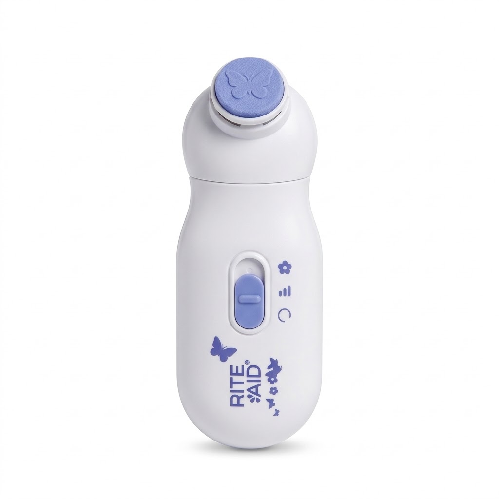 The Rite Aid Baby Nail Trimmer is designed to safely and gently trim and file a baby’s delicate nails. This electric nail care device uses soft filing pads that help smooth and shape nails without the risk associated with traditional nail clippers.