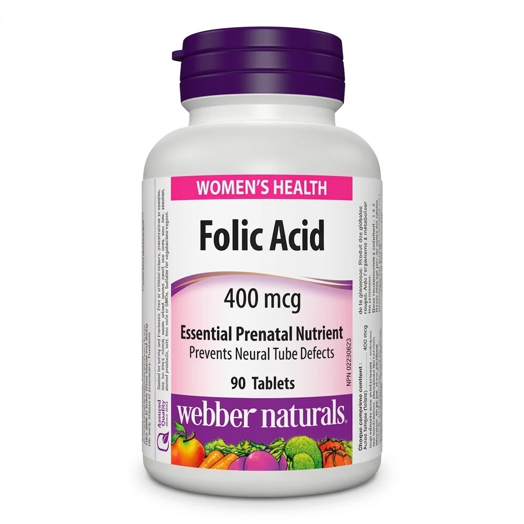 Webber Naturals Folic Acid 400 mcg Tablets provide essential nutritional support for overall health, particularly for women of childbearing age. Folic acid, a vital B-vitamin (Vitamin B9), plays an important role in red blood cell formation, DNA synthesis, and proper cell growth.